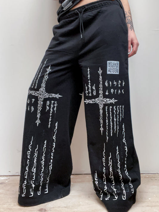 Alien Contact Hand printed wide leg tracksuit bottoms/ joggers. (Gender Neutral. Black)